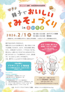 イベント情報・活動報告⼀覧 2026年 2026.01.22 お知らせ みそづくり 体験してみませんか 2026年 2025年 2024年 2023年 2022年 2021年 2020年 2019年 2018年 2017年 2016年 2015年 2014年 2013年 2012年 2011年